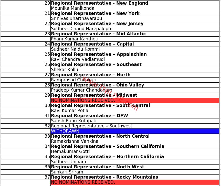 ఇదే సెలక్షన్ పద్ధతిలో కార్యదర్శిగా పంత్ర సునీల్, కోశాధికారిగా కసుకుర్తి రాజా, సహాయ కార్యదర్శిగా కొణిదెల లోకేష్, సహాయక కోశాధికారిగా యార్లగడ్డ రాజేష్లు ఎంపికయ్యారు. తానా కార్యక్రమాల నిర్వహణ సమన్వయకర్త పదవికి ఒక్క నామినేషన్ కూడా దాఖలు కాకపోవడం గమనించవల్సిన విషయం.