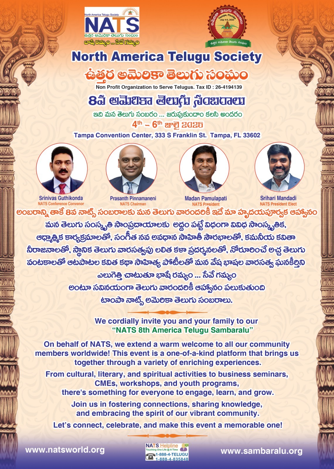 We are excited to extend a personal invitation to you for the 8th NATS America Telugu Sambaralu 2025, happening in beautiful Tampa, FL. This much-anticipated event will take place from July 4th to July 6th, and it promises to be a wonderful celebration of our Telugu heritage.