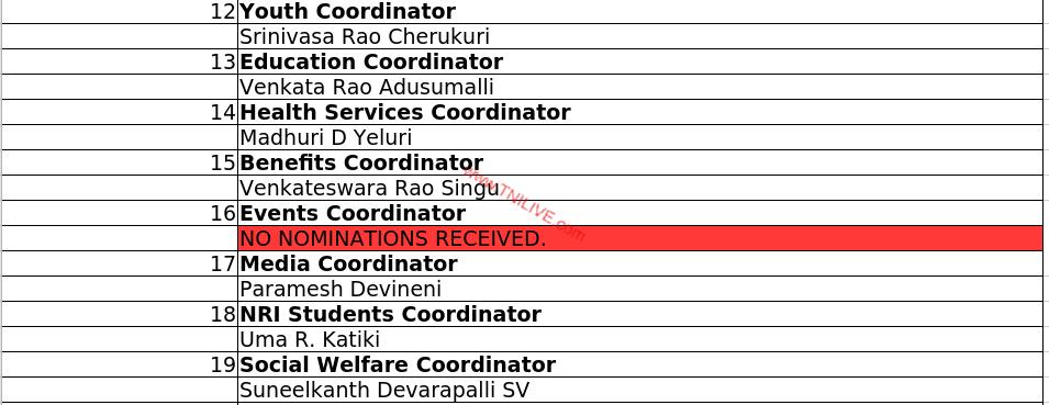 ఇదే సెలక్షన్ పద్ధతిలో కార్యదర్శిగా పంత్ర సునీల్, కోశాధికారిగా కసుకుర్తి రాజా, సహాయ కార్యదర్శిగా కొణిదెల లోకేష్, సహాయక కోశాధికారిగా యార్లగడ్డ రాజేష్లు ఎంపికయ్యారు. తానా కార్యక్రమాల నిర్వహణ సమన్వయకర్త పదవికి ఒక్క నామినేషన్ కూడా దాఖలు కాకపోవడం గమనించవల్సిన విషయం.